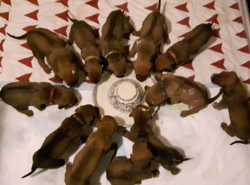 Hierdoor groeien ze ook als kool, beide pups wegen zelfs al bijna 1 kilo. Elke avond zijn we weer verbaasd hoe snel het gaat. Het teefje begint zelfs al een klein beetje haar oogjes te openen.